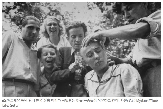 이번 주 D-day 상륙작전 65주년을 맞아 1944년 프랑스 해방 당시의 기쁨에 찬 사진들을 다시 살펴보게 된다. 하지만 환희에 찬 이미지들 사이에는 충격적인 사진들도 존재한다. 바로 '수평적 협력' 혐의로 기소된 여성들의 비극적인 운명을 보여주는 사진들이다. 특히 로버트 카파가 촬영한, 머리를 삭발한 젊은 여성이 독일군 병사와의 관계에서 얻은 아이를 품에 안고 있는 모습은 잊을 수 없다.